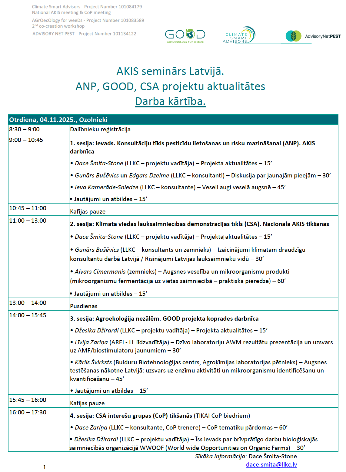 AKIS seminārs Latvijā. ANP, GOOD, CSA projektu aktualitātes Sākas 04.11.2025 08:30 Beidzas 04.11.2025 17:30 Vieta LLKC, Rīgas iela 34, Ozolnieki, Ozolnieku pagasts, Jelgavas novads