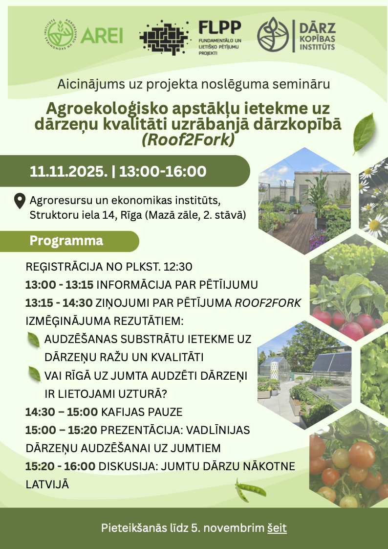 Agroekoloģisko apstākļu ietekme uz dārzeņu kvalitāti uzrābanjā dārzkopībā (Roof2Fork) Sākas 11.11.2025 13:00 Beidzas 11.11.2025 16:00 Vieta Rīga, Struktoru iela 14, Mazā zāle