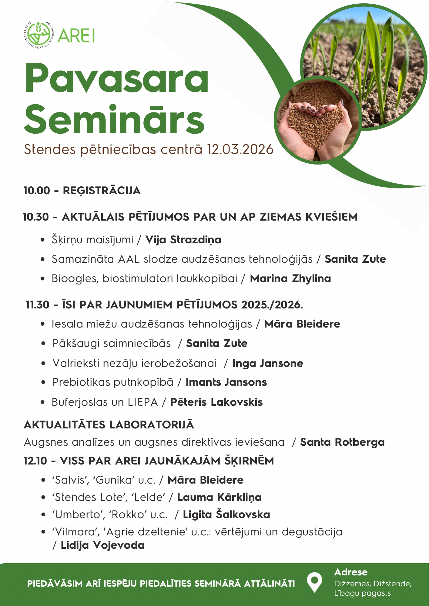 Pavasari gaidot, aicinām apmeklēt ikgadējo pavasara semināru AREI Stendes pētniecības centrā, 2026. gada 12. martā Dizštendē.