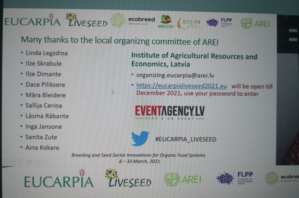 Agroresursu un ekonomikas institūts (AREI) sadarbībā ar Eiropas augu selekcijas pētniecības asociāciju EUCARPIA, HORIZON 2020 programmas projektu LIVESEED un vairākiem citiem pētniecības projektiem veiksmīgi aizvadījis starptautisku tiešsaistes konferenci, kas veltīta selekcijas un sēklaudzēšanas sektora inovācijām bioloģiskajām pārtikas sistēmām Eiropā. Konference norisinājās 8.-10.martā.