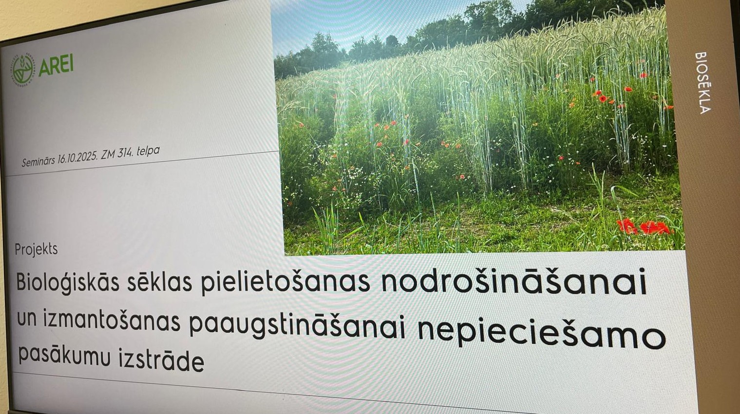 Jau trīs gadus AREI zinātnieki ZM atbalstītā pētnieciskā projekta ietvaros strādā pie priekšlikumu izstrādes, kā nodrošināt vienīgi bioloģiskās sēklas izmantošanu bioloģiskajā saimniekošanā. Kā zināms, ES regula paredz, ka 2036. gadā pārtrauks atļauju izsniegšanu konvenciālas sēklas izmantošanai bioloģiskajos laukos. Pētnieki pārbaudījuši labību un zirņu šķirņu piemērotību audzēšanai bioloģiskajos laukos trīs Latvijas reģionos, izvērtējuši iemeslus ne-bioloģiskas sēklas izmatošanai, noskaidrojuši šķirņu piedāvājumu un bioloģiskās sēklas izmantošanu citās ES valstīs, meklējuši risinājumus līdzīgu pētniecisko projektu atziņās.